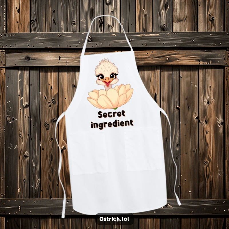 Add a playful touch to your kitchen adventures with this funny ostrich apron. A surprised ostrich peeking over a flower is sure to delight.